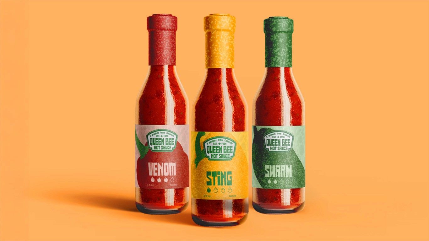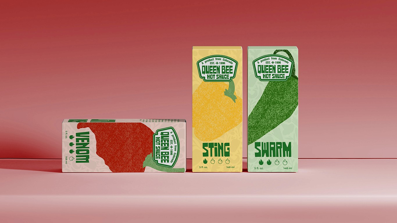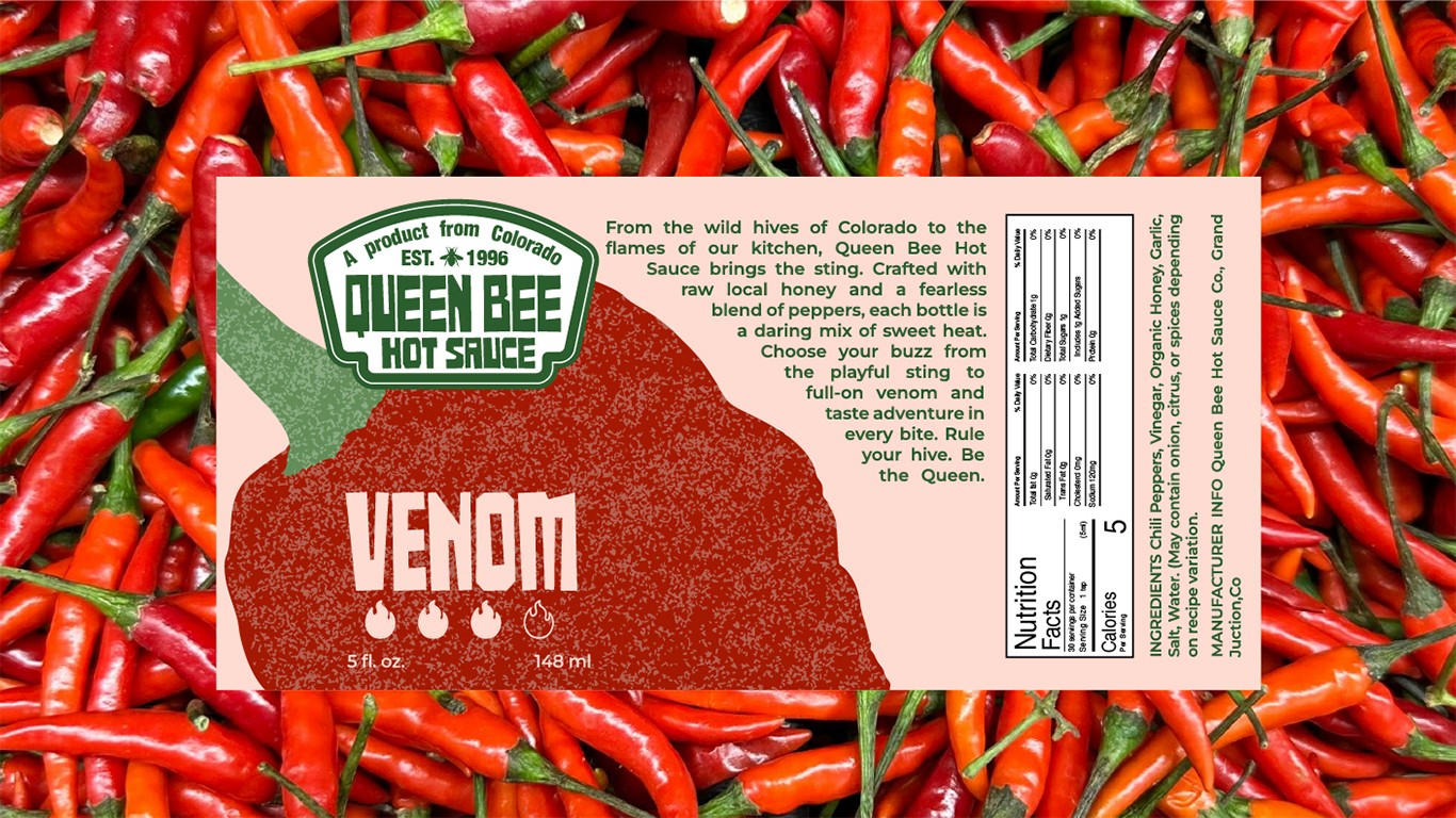 Queen Bee Hot Sauce was created to capture bold flavor, rebellion, and craftsmanship. The goal was to design packaging that stood out on the shelf while feeling authentic and artisanal. I designed the full packaging system, including the logo and custom pepper illustrations, developing a consistent layout across the three heat levels, Sting, Swarm, and Venom. Inspired by the look of farm signage, the design connects to the brand’s organic roots while bold typography and striking visuals convey its rebellious attitude. The result is a distinctive identity that feels handcrafted and fearless, a celebration of heat, flavor, and individuality