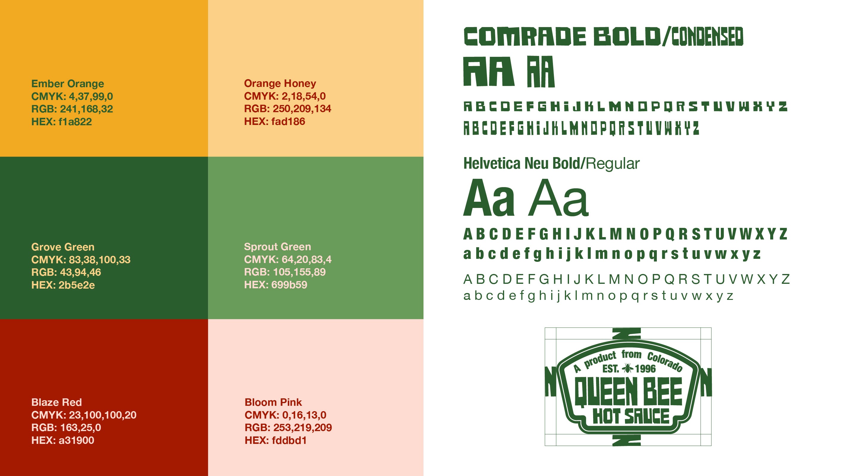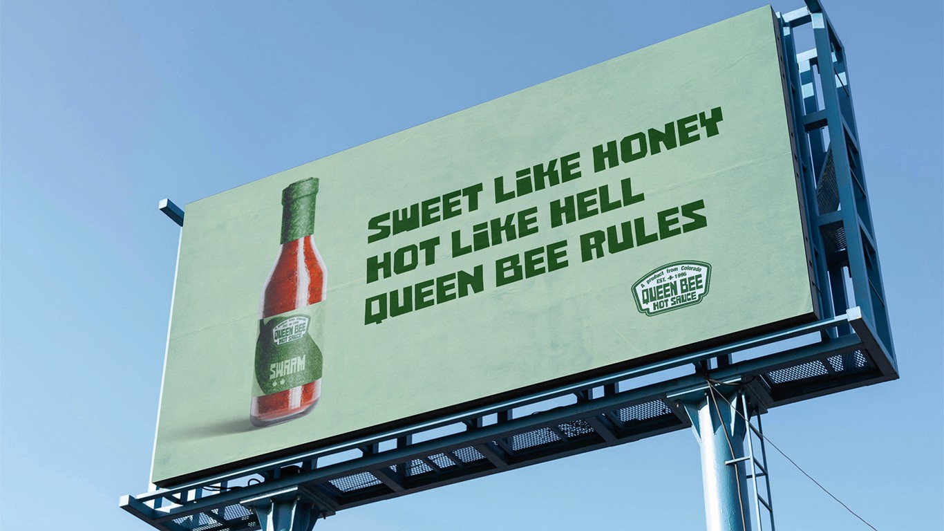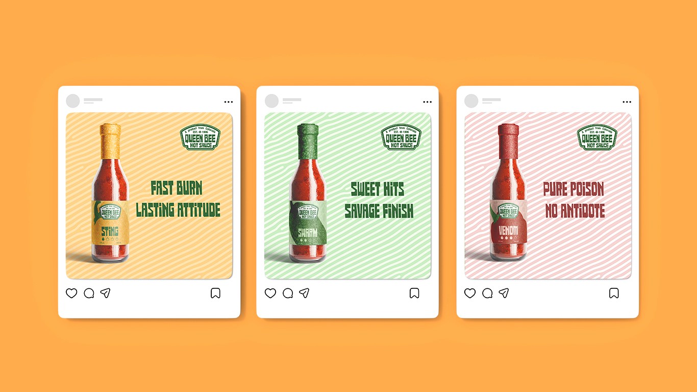 Queen Bee Hot Sauce was created to capture bold flavor, rebellion, and craftsmanship. The goal was to design packaging that stood out on the shelf while feeling authentic and artisanal. I designed the full packaging system, including the logo and custom pepper illustrations, developing a consistent layout across the three heat levels, Sting, Swarm, and Venom. Inspired by the look of farm signage, the design connects to the brand’s organic roots while bold typography and striking visuals convey its rebellious attitude. The result is a distinctive identity that feels handcrafted and fearless, a celebration of heat, flavor, and individuality