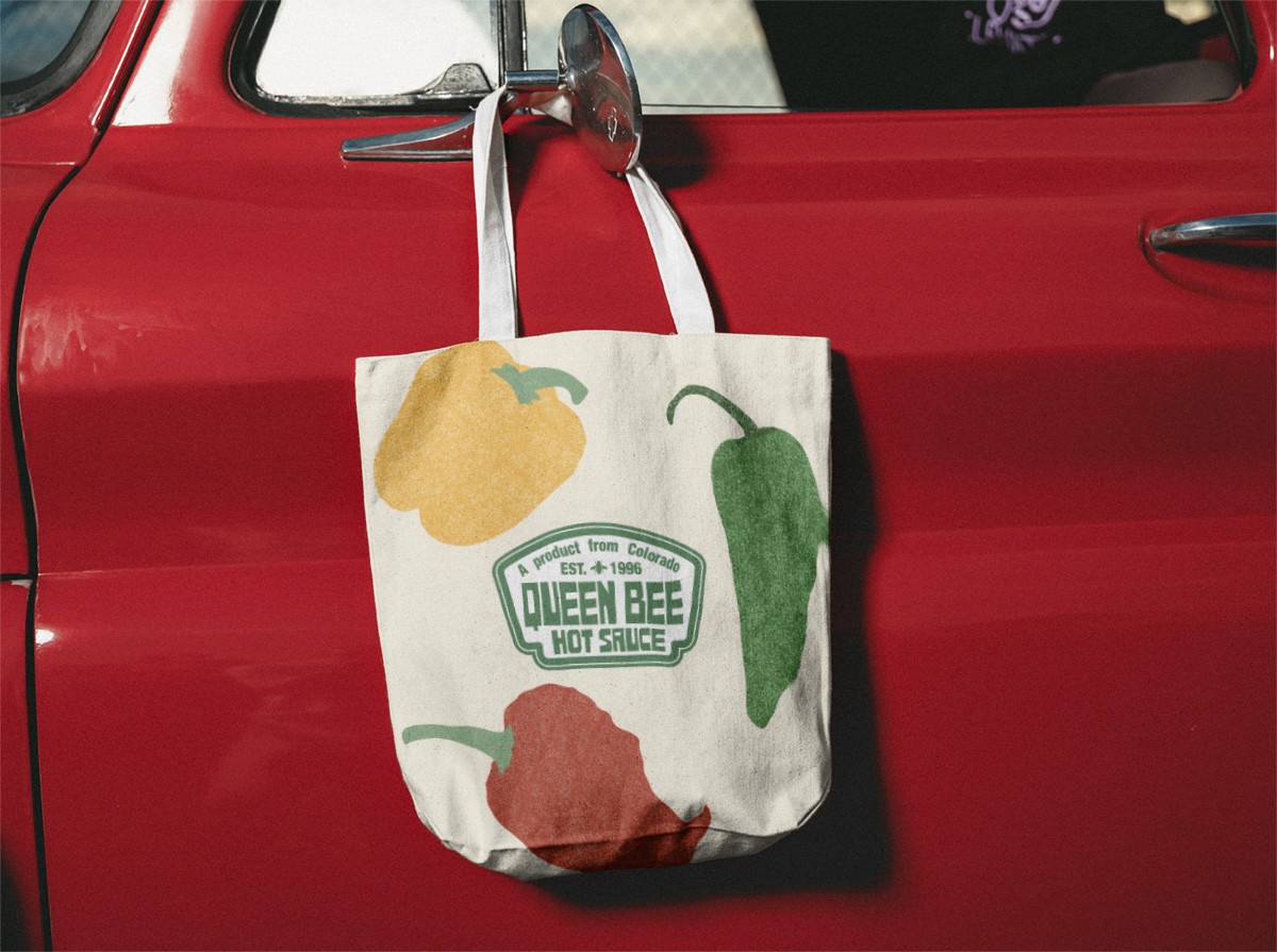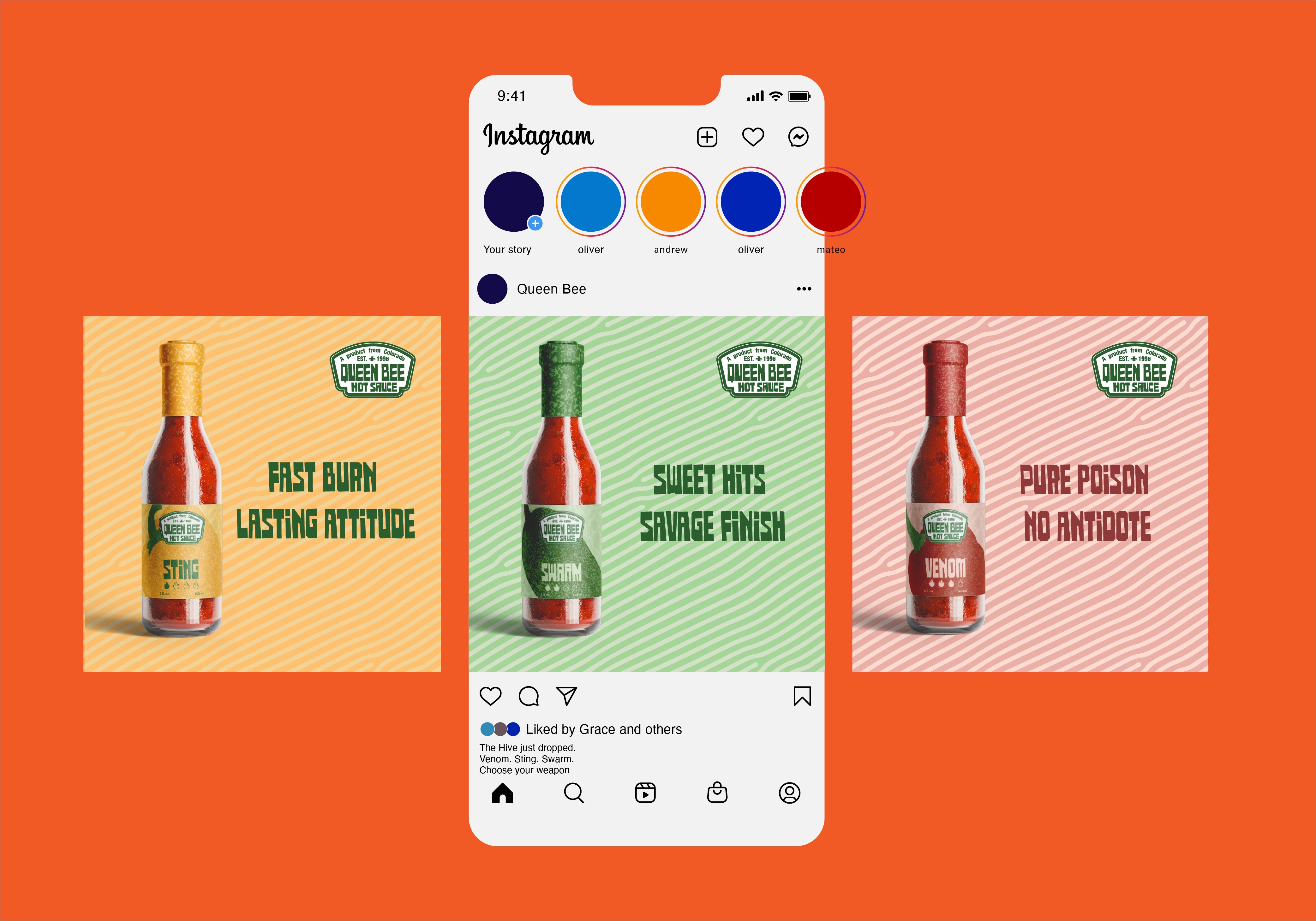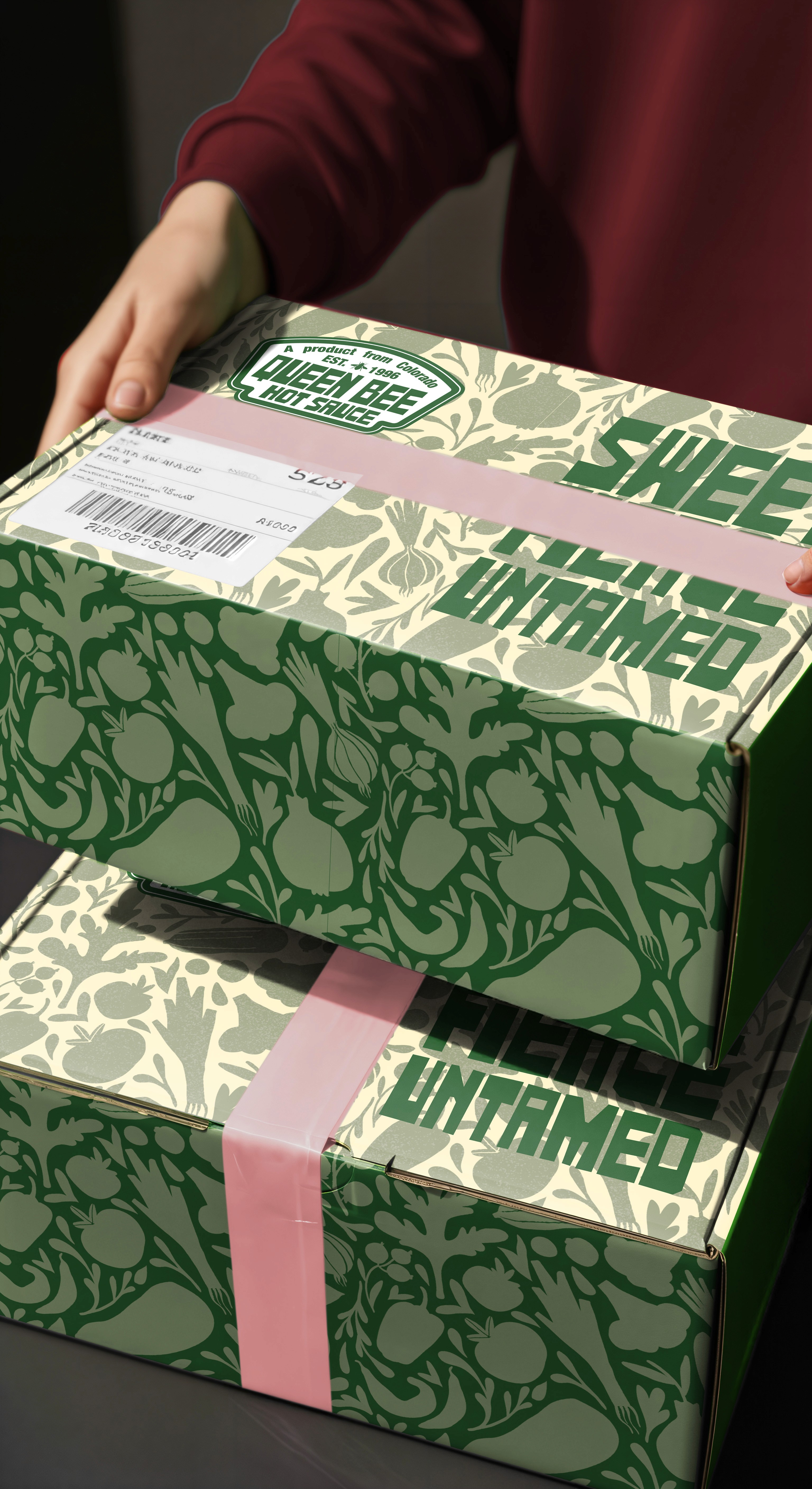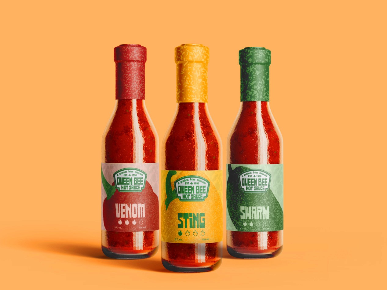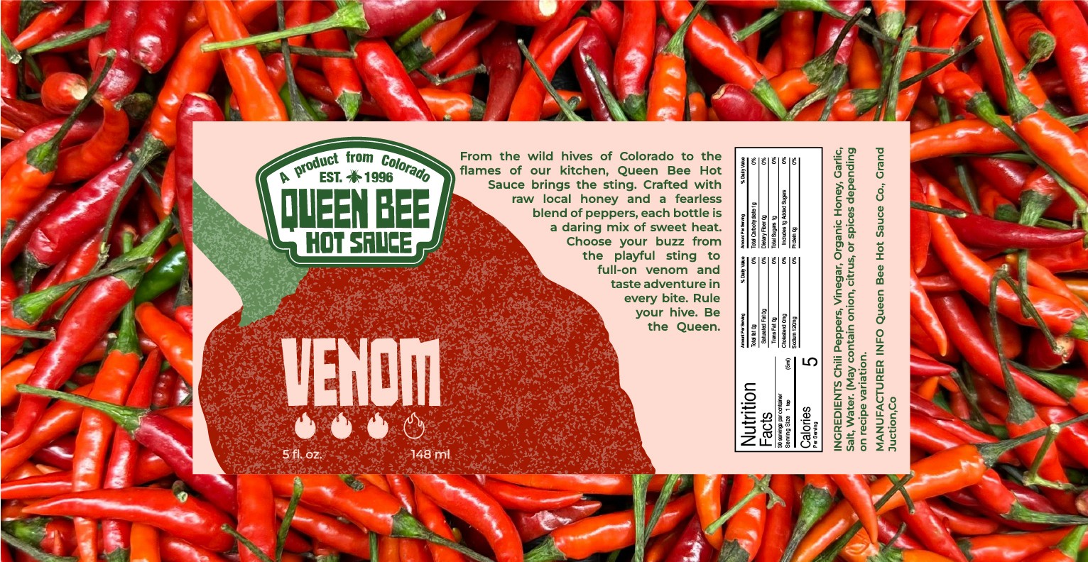 Queen Bee Hot Sauce was created to capture bold flavor, rebellion, and craftsmanship. The goal was to design packaging that stood out on the shelf while feeling authentic and artisanal. I designed the full packaging system, including the logo and custom pepper illustrations, developing a consistent layout across the three heat levels, Sting, Swarm, and Venom. Inspired by the look of farm signage, the design connects to the brand’s organic roots while bold typography and striking visuals convey its rebellious attitude. The result is a distinctive identity that feels handcrafted and fearless, a celebration of heat, flavor, and individuality