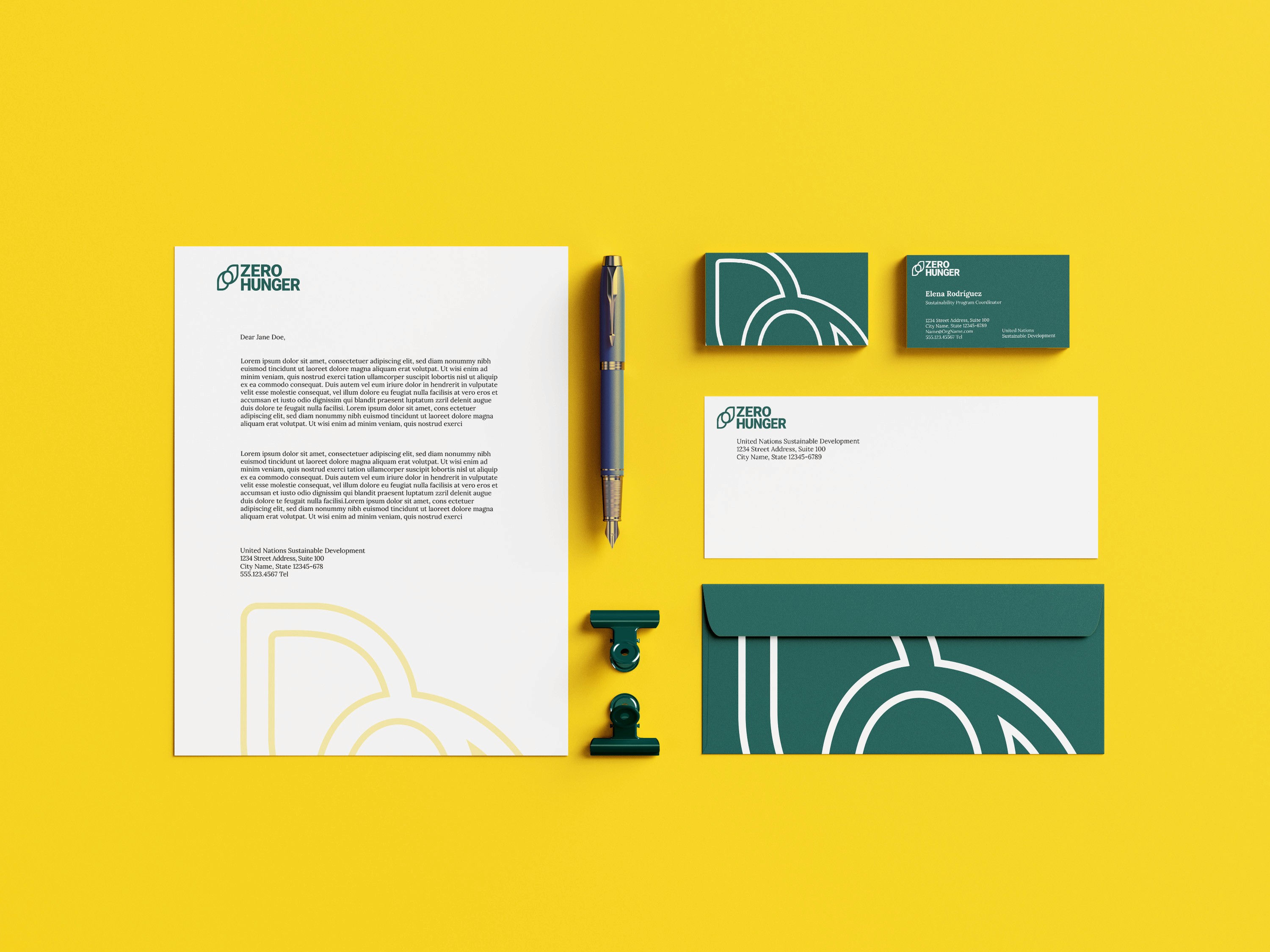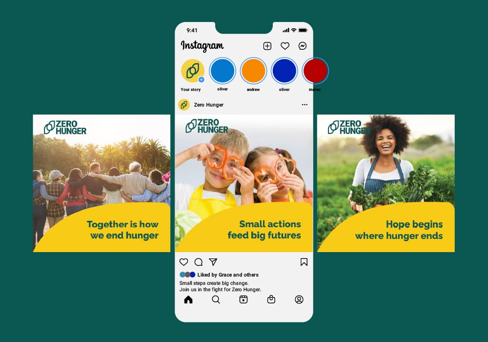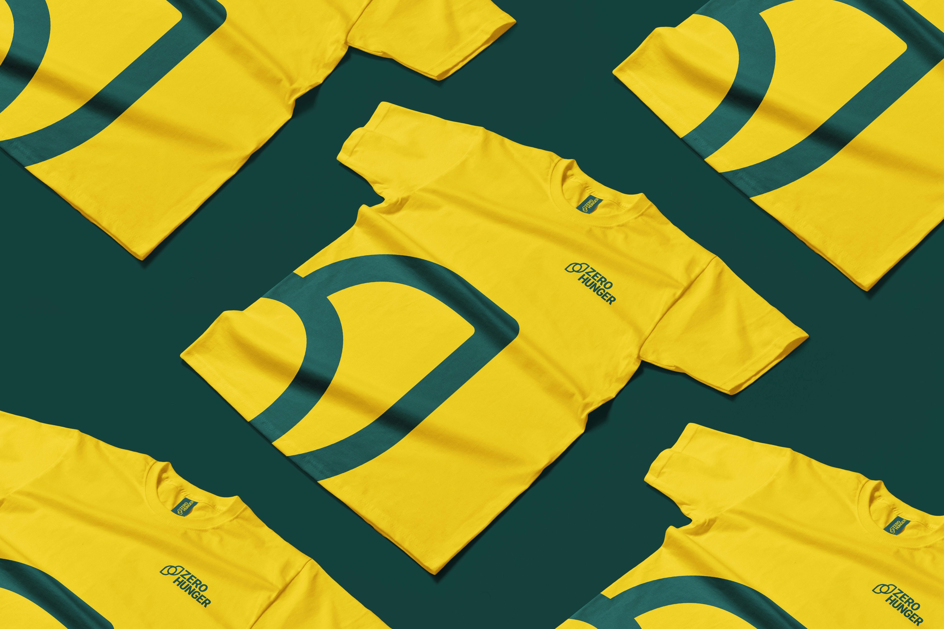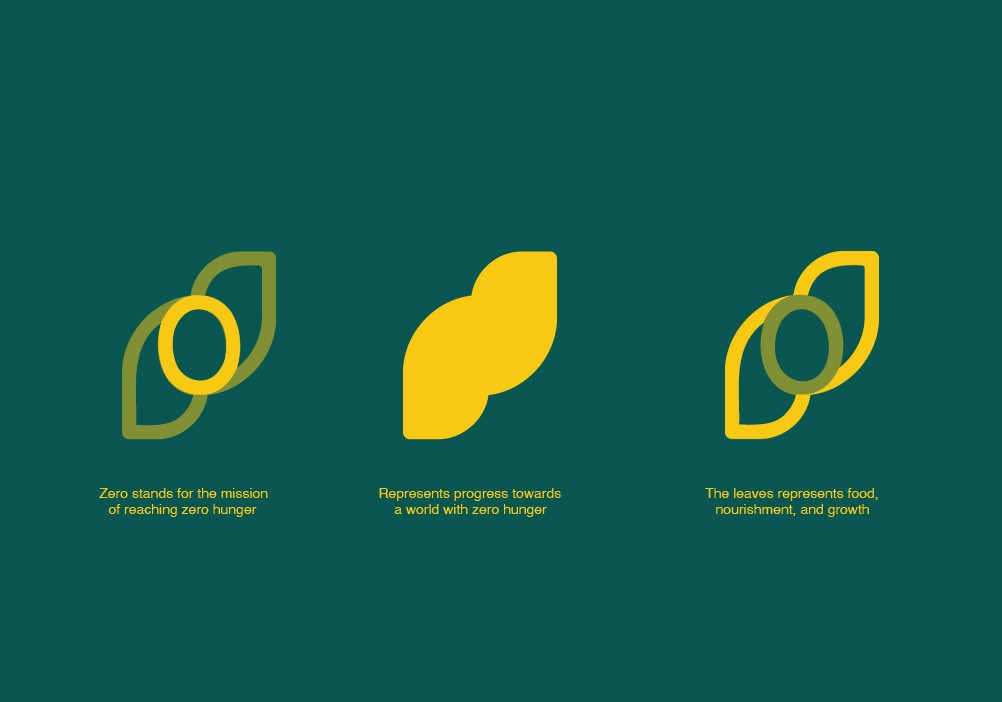 The Zero Hunger brand identity was developed to function across a wide range of applications, from social media graphics and printed materials to uniforms, signage, and campaign assets. The visual system prioritizes clarity and flexibility so it can scale and adapt without losing recognition. The mark combines the text “Zero Hunger” with a simple symbol built around the number zero, referring to the objective of reaching zero hunger worldwide. Two leaf forms on each side represent food and growth, and their stepped arrangement suggests progress.